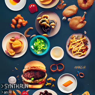 Food style appears to be odd interpretations of common foods... are they mushrooms in chocolate sauce? Is that a waffle, a beef roast, and a hummus platter inside a burger? Why are the fries melting like cheese? I'm not sure the AI knows what AI food is and neither do I...